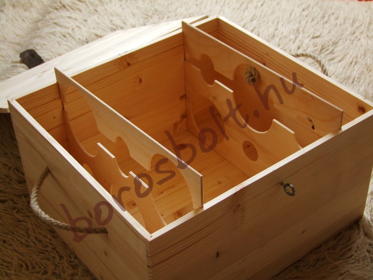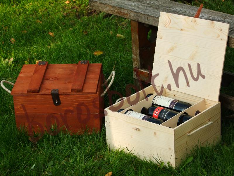 Natúr és Pácolt Színű Bortartó Fa láda 6 Palacknak. Ebbe a Boros faládába bordói vagy burgundi méretű palackokat tudsz beletenni.