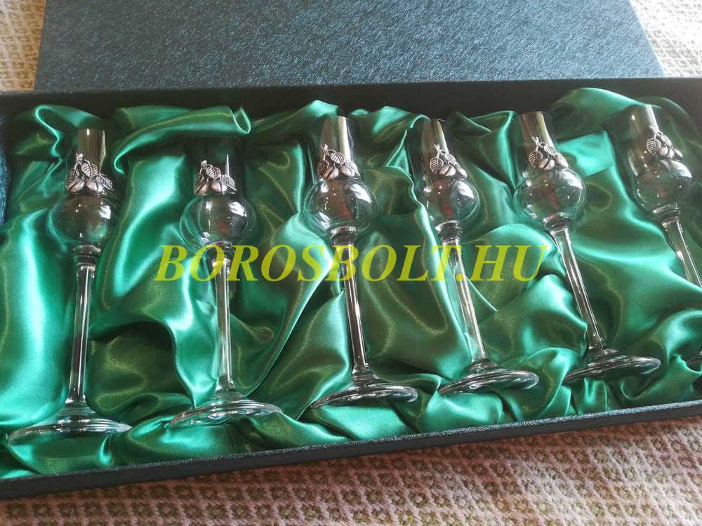 6 darabos Pálinkáspohár Készlet Címeres és Gyümölcsös Ón Díszítéssel